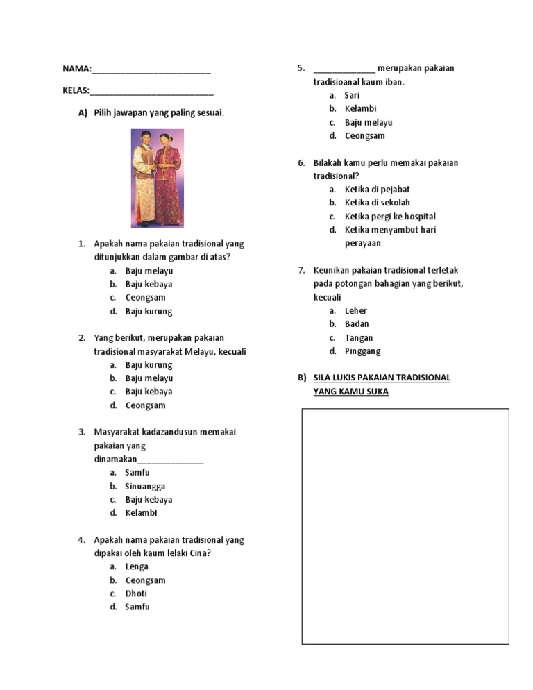 Up to 24 cash back Kini pakaian tradisional seperti kebaya Melayusari India dan cheongsam Cina masih digunakan dengan meluas di Malaysia. Kanak-kanak menjawab soalan pakaian tradisional. Baca petikan puisi di bawah ini dan jawab soalan-soalan yang mengikutinya.